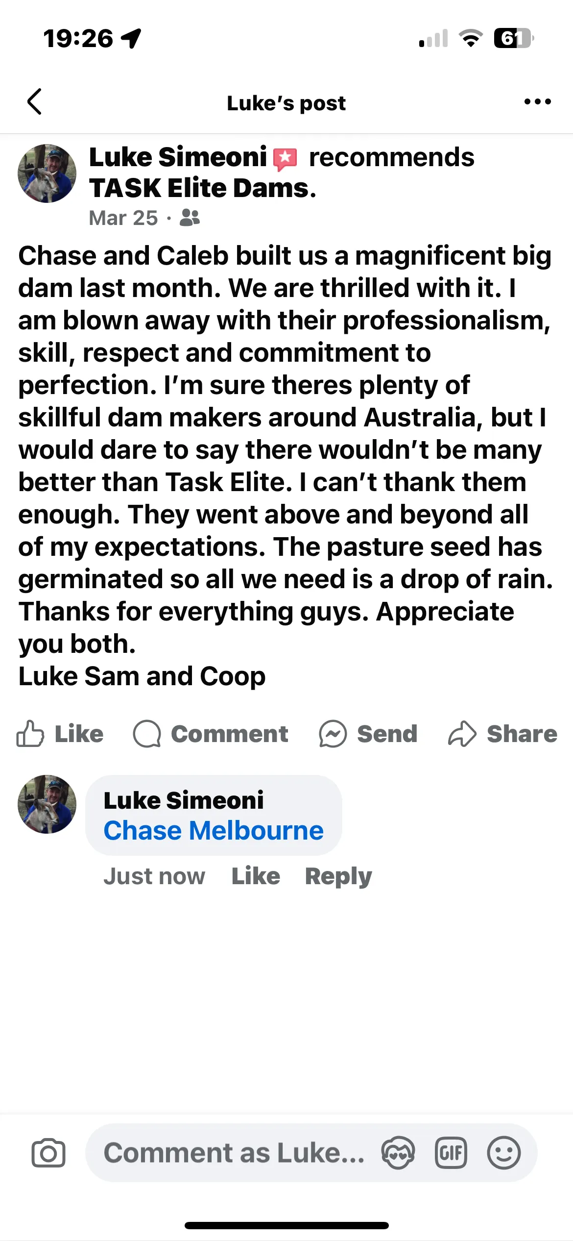 At TASK Elite Dams, we don’t just build dams – we create lasting value for your land. Founded by Chase Melbourne, we’re a small, experienced team with deep roots in earthmoving and a reputation across Victoria for doing the job right the first time.